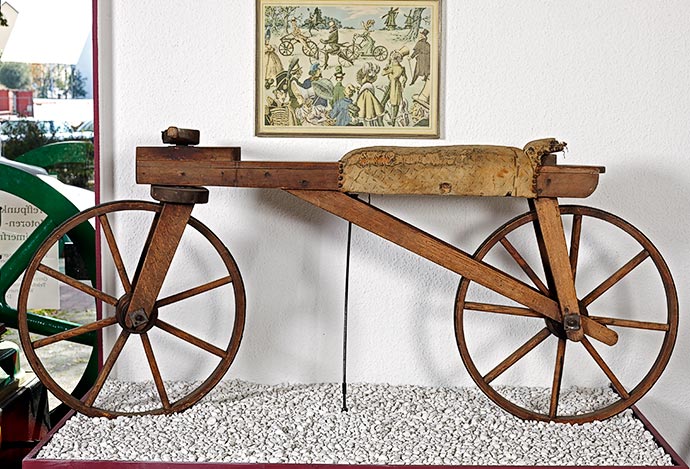 Eine hölzerne Laufmaschine nach dem Vorbild des ersten Laufrades von Freiherr von Drais. Das Baujahr der lenkbaren Laufmaschine in der Technischen Sammlung Hochhut ist unbekannt, jedoch stammt sie nicht aus dem 19. Jahrhundert.